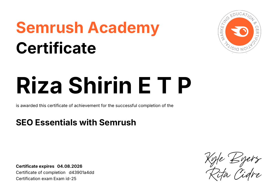 I’m Riza Shirin, Digital Marketing Strategist in Kannur, specializing in SEO, SMM, SEM, web design,content creation and video editing. I completed my BBA under Kannur University and trained at Opentutor Digital Academy, Kannur. I focus on building effective strategies and help brands maintain a strong consistent digital presence.